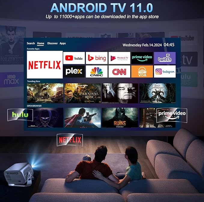 Access your favorite streaming apps—including Netflix, YouTube, and more—directly from the projector. The Android 11.0 interface offers smooth, user-friendly navigation for effortless entertainment.
